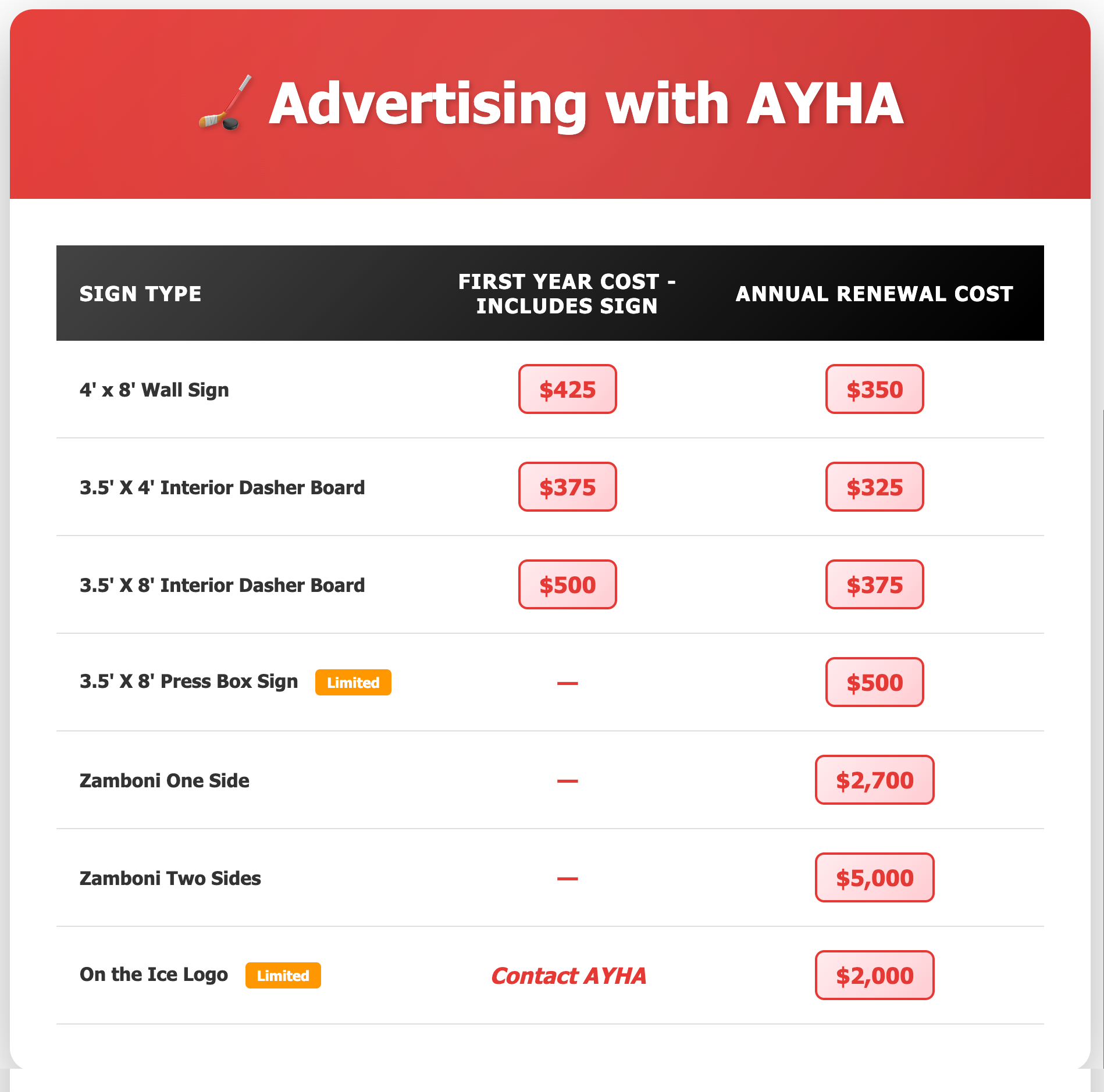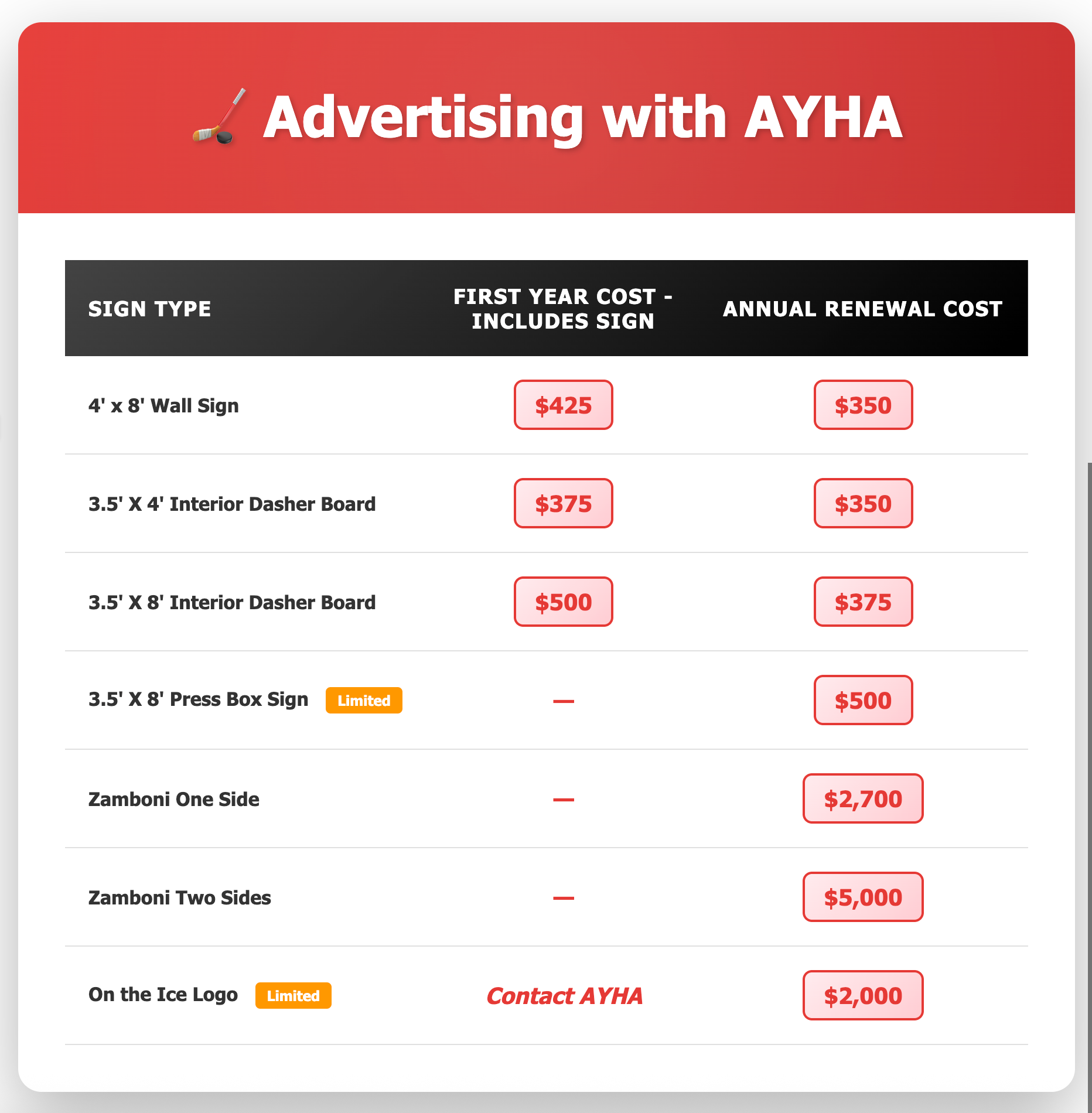 We hope you will consider supporting the Altoona Youth Hockey Association through the purchase of an advertising sign. We believe this advertising provides a good value to you, considering the traffic of visitors we have each year.